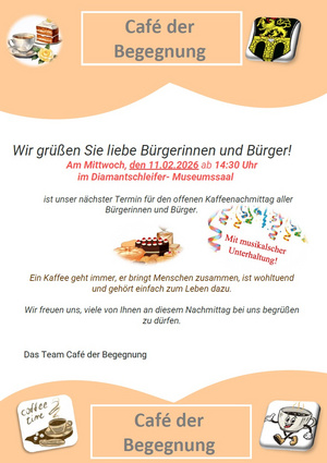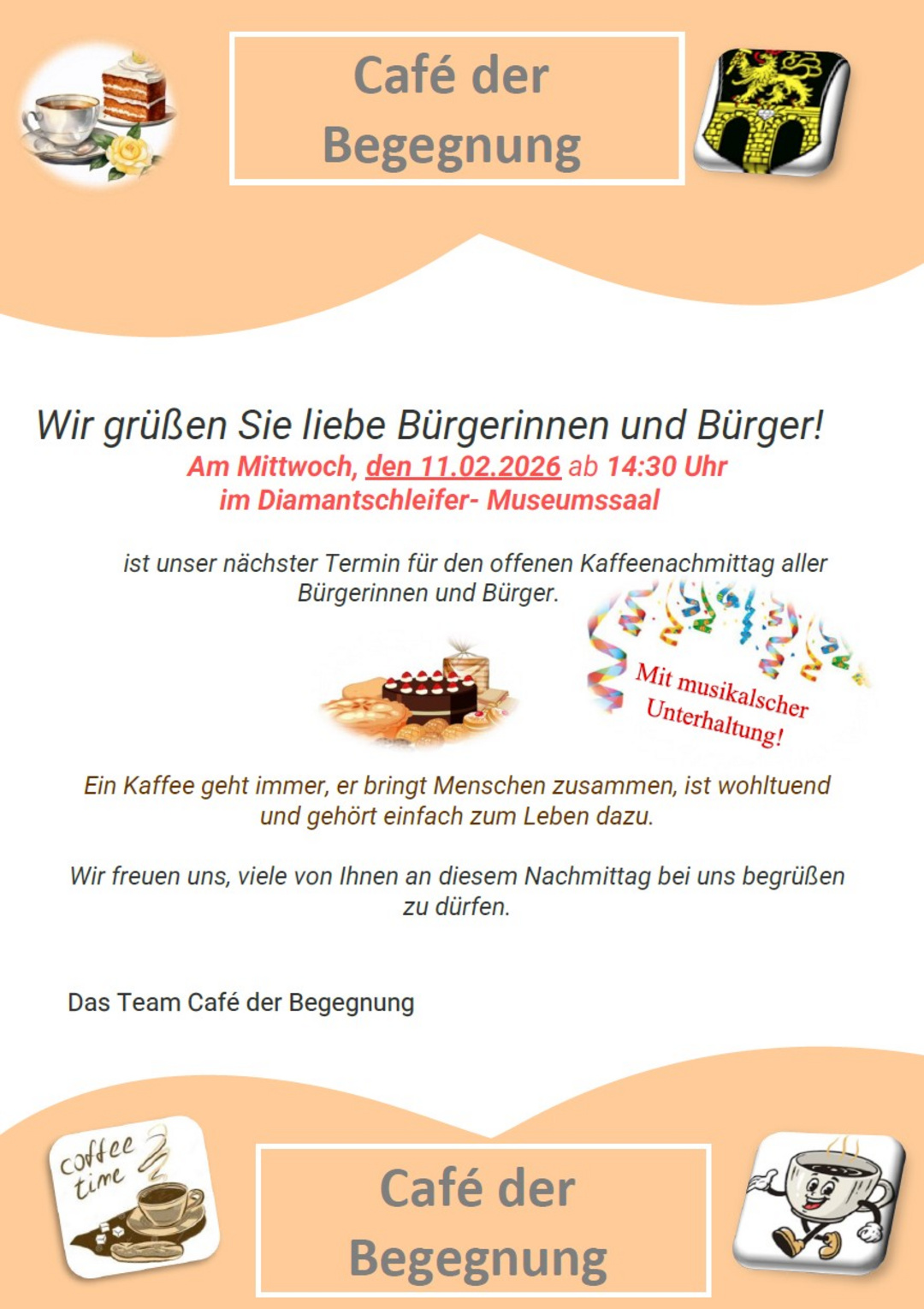 Das Team des „Café der Begegnung“ lädt alle Bürgerinnen und Bürger herzlich zum nächsten offenen Kaffeenachmittag ein. Die Veranstaltung findet am Mittwoch, den 11. Februar 2026, statt. Los geht es ab 14:30 Uhr im Diamantschleifer-Museumssaal.