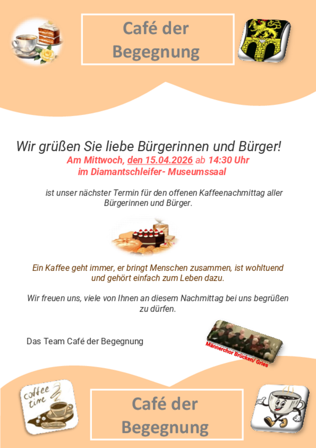 Am Mittwoch, den 15. April 2026, findet ab 14:30 Uhr im Diamantschleifer-Museumssaal erneut das Café der Begegnung statt. Eingeladen sind alle Bürgerinnen und Bürger, die einen gemütlichen Nachmittag in geselliger Runde verbringen möchten.